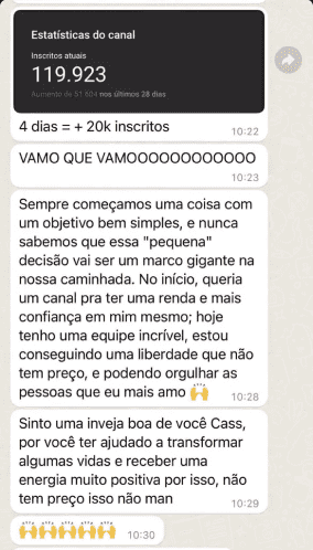 O segundo melhor momento é começar agora, com todo o método pronto e comprovado, que já ajudou mais de 1.000 clientes a aumentarem sua renda e atingirem a tão sonhada liberdade financeira através de canais lucrativos no Youtube.”
